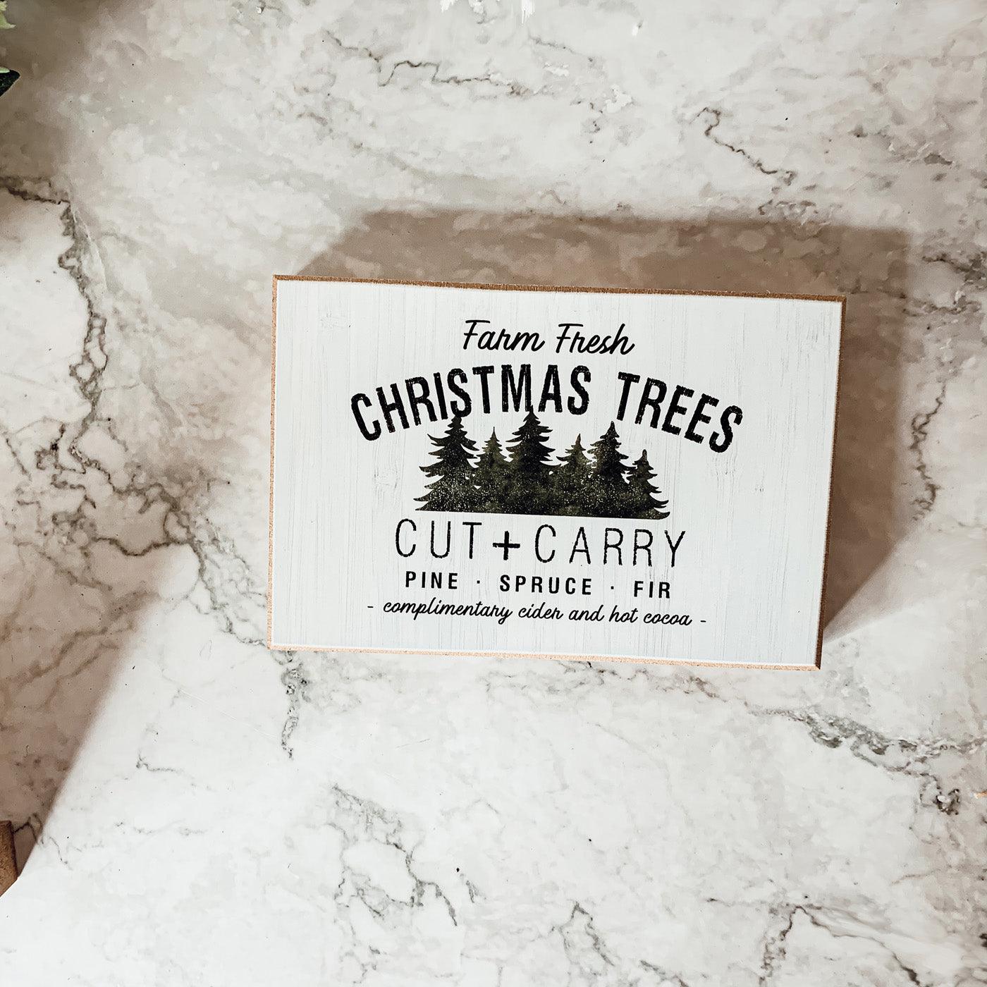 "Farm Fresh Christmas Trees Cut + Carry Pine Spruce Fir complimentary cider and hot cocoa."